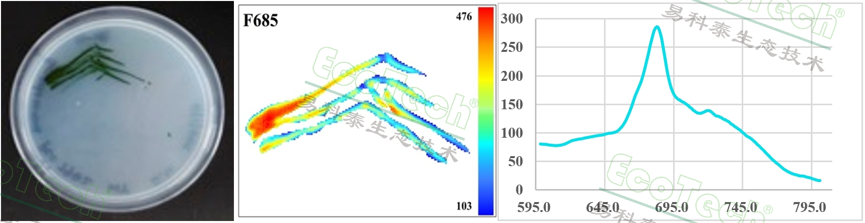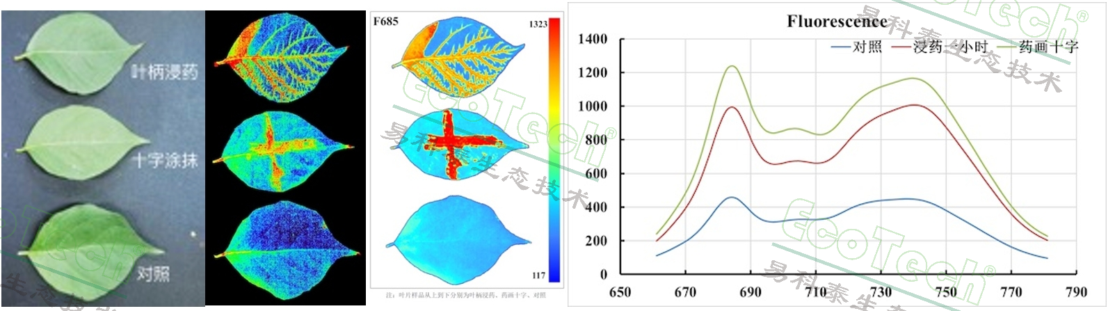 µÐ²Ý¡´¦Öóͷ£ÎÚÝüݮʵÑ飺×óͼ×óÉϽǺÍÓÒϽÇΪʵÑé×飨Ҷ±ú½þÒ©£©¡¢ÓÒÉϽǺÍ×óϽÇΪ±ÈÕÕ×飬£¬£¬£¬£¬£¬£¬¿ÉÒÔ¿´³öʵÑé×éµÄÒ¶±úºÍÒ¶Âö×î´ó¹âÁ¿×Ó²úÁ¿QY_maxÏÔ׎µµÍ£¨À¶É«£©£»£»£»£»£»£»£»£»ÓÒͼΪÆäÒ¶ÂÌËØÓ«¹â¹âÆ×£¬£¬£¬£¬£¬£¬£¬ÊµÑé×éÒ¶ÂÌËØÓ«×ÆË¸ÏÔ¸ßÓÚ±ÈÕÕ×飨º£ÑóÖ®Éñ590¹ÙÍøÈë¿ÚSpectrAPP¹âÆ×³ÉÏñʵÑéÊÒÌṩ£©